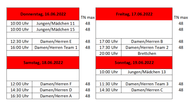 Dazu Cafeteria, Grillstand, Getränkewagen und eine große Tombola. Alle Turnierklassen werden auf maximal 48 Teilnehmer*innen begrenzt. Es wird 2G gelten und ein Hygienekonzept ist Bestandteil der Veranstaltung. Die Schirmherrschaft hat Marcel Mittelbach (Bürgermeister der Stadt Waltrop) gerne übernommen.
