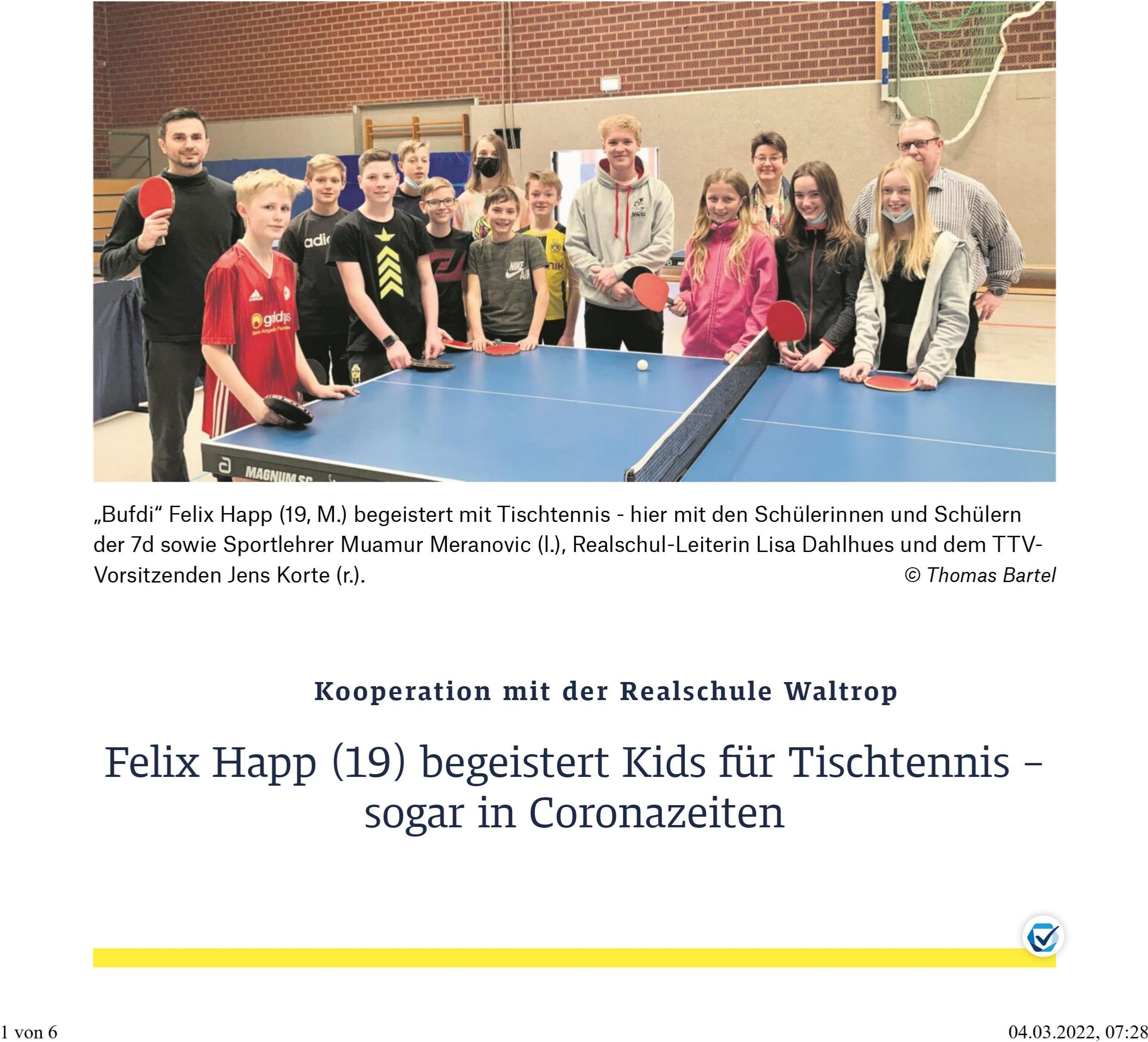 WZ-Plus: Felix Happ begeistert Kinder für Tischtennis von Jens Korte | März 4, 2022 | Aktuelles | 0 Kommentare Als WZ-Plus-Kunde können Sie den ganzen Artikel lesen unter