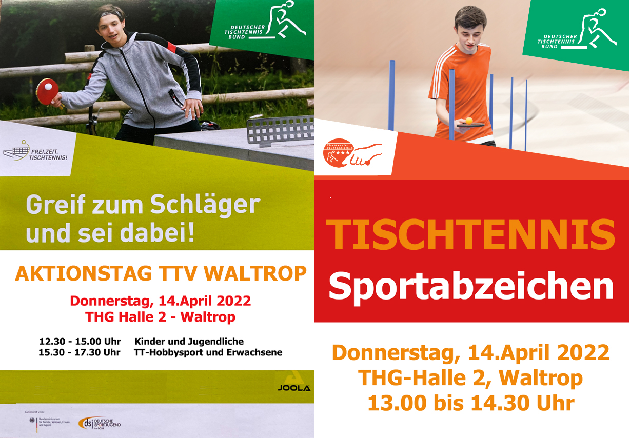 Am Gründonnerstag: AKTIONSTAG BEIM TTV WALTROP von Jens Korte | Apr. 11, 2022 | Aktuelles | 0 Kommentare Gründonnerstag, 14. April 2022 ist es soweit. Wir laden ein zum Aktionstag Tischtennis. https://www.youtube.com/watch?v=GquhnDmIVMQ Mini-Tische, Riesenrundlauf, Ballmaschine, Tischtennis ausprobieren… Seid dabei und kommt vorbei. Wir freuen uns auf Euch!