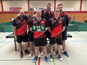 Unsere erste Herren hat in der Bezirksoberliga die Saison mit einem Ausrufezeichen beendet. Beim bisherigen Tabellenführer und Aufstiegsfavoriten TTV Hervest-Dorsten e.V. setzten sich unsere Jungs mit einen tollen Mannschaftsleistung verdient durch.